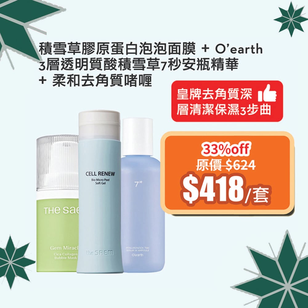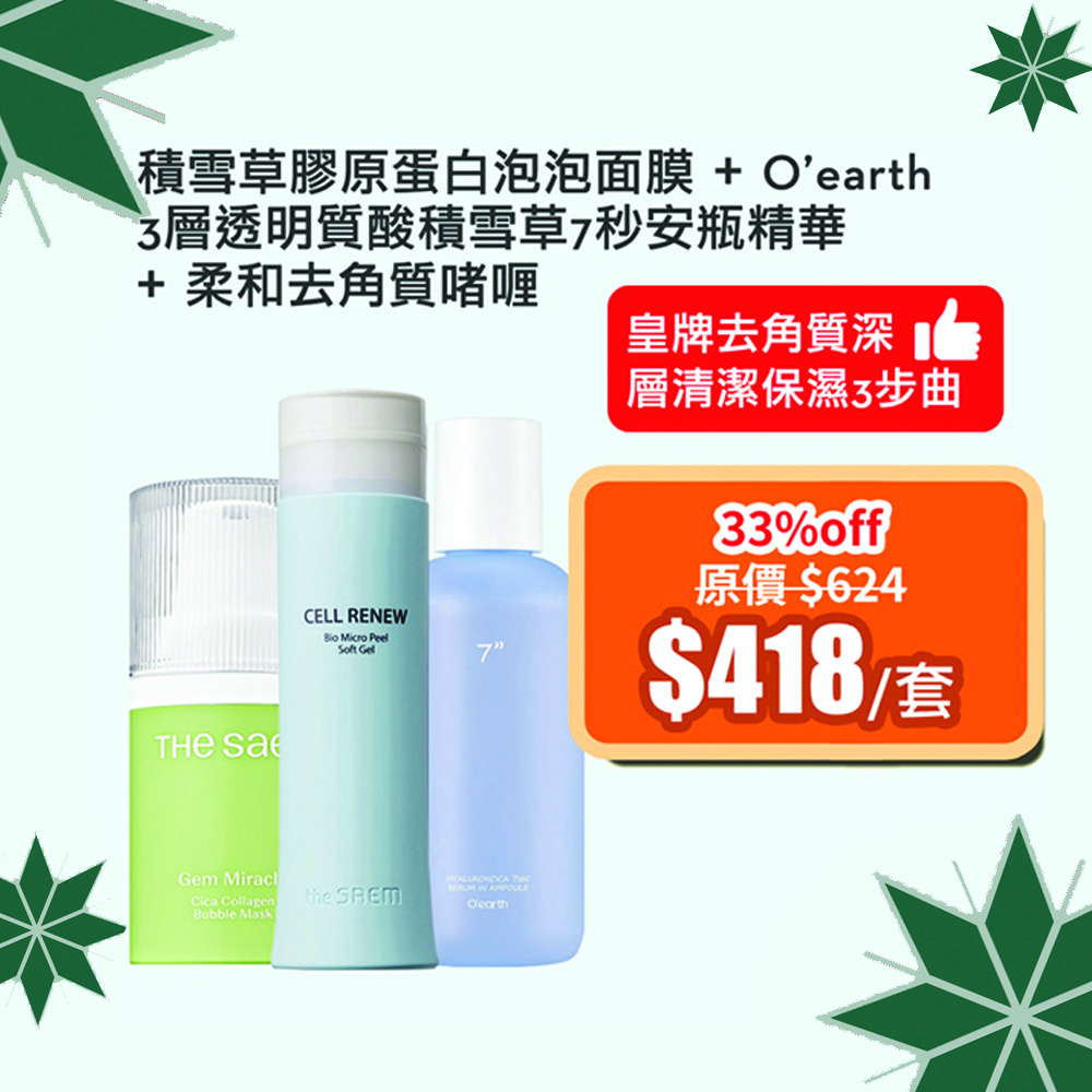 **節日限定皇牌去角質深層清潔保濕組合** 組合包括: 1) 柔和去角質啫喱 160ml 2) 積雪草膠原蛋白泡泡面膜 50g 3) O'earth 3層透明質酸積雪草7秒安瓶精華 105ml 功效: 1) 柔和去角質啫喱能夠溫和去除老化角質,用後即時呈現白滑肌膚,而且性質溫和不刺激。 2) 積雪草膠原蛋白泡泡面膜透過綿密的氣泡深入清潔毛孔,同時注入積雪草、膠原蛋白和透明質酸3重滋養成份,為肌膚帶來舒緩、緊緻和水潤保濕的全面護理。 適合各類肌膚,尤其是需要毛孔清潔和保濕補水的使用者。 3) 3層透明質酸積雪草7秒安瓶精華是採用**三重透明質酸分層滲透技術**(超低分子至高分子)與**6種積雪草複合萃取物(CICA6)**,實現7秒快速吸收,直達肌底補水,同時舒緩敏感、強化屏障。 專為解決「外油內乾」「妝容浮粉」「深層乾燥」等肌膚問題設計,適合所有膚質,尤其敏感肌膚與缺水肌。 **使用方法** Step 1 (柔和去角質啫喱) 潔面後,擦乾肌膚水份,取適量產品,避開眼唇肌膚,塗抹在面部肌膚上,打圈按摩肌膚,待角質和老廢物質溶解釋出後,再用溫水清洗乾淨即可。 Step 2 (積雪草膠原蛋白泡泡面膜) 潔面後,擦乾水份,取適量面膜避開眼周均勻塗抹,等待起泡後,輕揉按摩促進吸收,再次起泡後用溫水洗淨便可。 Step 3 (3層透明質酸積雪草7秒安瓶精華) 潔面後,取適量精華 ,均勻塗抹於臉部,輕拍至吸收(無需沖洗)。