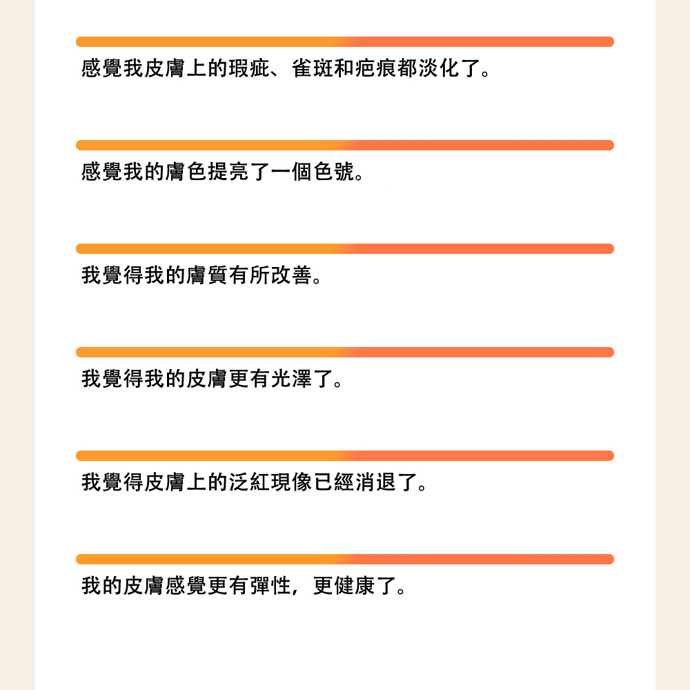 - 使用8週以上:明顯淡斑效果,肌膚屏障顯著強化
