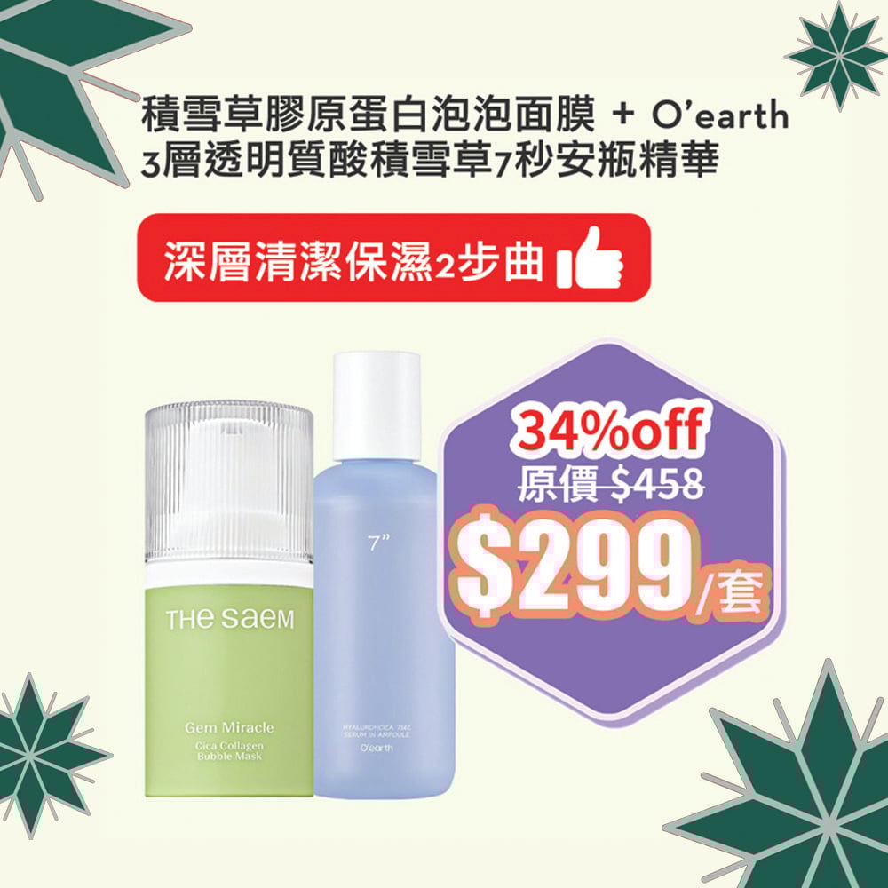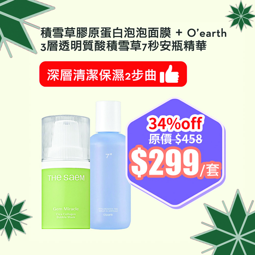 **節日限定毛孔清潔保濕組合** 組合包括: 1) 積雪草膠原蛋白泡泡面膜 50g 2) O'earth 3層透明質酸積雪草7秒安瓶精華 105ml 功效: 1) 積雪草膠原蛋白泡泡面膜透過綿密的氣泡深入清潔毛孔,同時注入積雪草、膠原蛋白和透明質酸3重滋養成份,為肌膚帶來舒緩、緊緻和水潤保濕的全面護理。 適合各類肌膚,尤其是需要毛孔清潔和保濕補水的使用者。 2) 3層透明質酸積雪草7秒安瓶精華是採用**三重透明質酸分層滲透技術**(超低分子至高分子)與**6種積雪草複合萃取物(CICA6)**,實現7秒快速吸收,直達肌底補水,同時舒緩敏感、強化屏障。 專為解決「外油內乾」「妝容浮粉」「深層乾燥」等肌膚問題設計,適合所有膚質,尤其敏感肌膚與缺水肌。 **使用方法** Step1: 潔面後擦乾水份,取適量面膜避開眼周均勻塗抹,等待起泡後,輕揉按摩促進吸收,再次起泡後用溫水洗淨便可。 Step 2: 潔面後,取適量精華 ,均勻塗抹於臉部,輕拍至吸收(無需沖洗)。 **建議頻率** 每週使用2-3次,或根據肌膚需求局部重點護理。