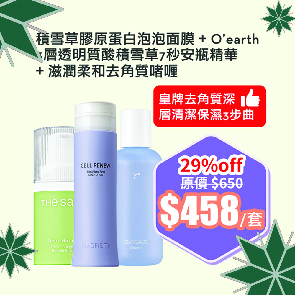 **節日限定皇牌去角質深層清潔保濕組合** 組合包括: 2) 抗敏柔和滋潤去角質啫喱 160ml 2) 積雪草膠原蛋白泡泡面膜 50g 3) O'earth 3層透明質酸積雪草7秒安瓶精華 105ml 3) 抗敏柔和滋潤去角質啫喱 160ml 功效: 1) 積雪草膠原蛋白泡泡面膜透過綿密的氣泡深入清潔毛孔,同時注入積雪草、膠原蛋白和透明質酸3重滋養成份,為肌膚帶來舒緩、緊緻和水潤保濕的全面護理。 適合各類肌膚,尤其是需要毛孔清潔和保濕補水的使用者。 2) 3層透明質酸積雪草7秒安瓶精華是採用**三重透明質酸分層滲透技術**(超低分子至高分子)與**6種積雪草複合萃取物(CICA6)**,實現7秒快速吸收,直達肌底補水,同時舒緩敏感、強化屏障。 專為解決「外油內乾」「妝容浮粉」「深層乾燥」等肌膚問題設計,適合所有膚質,尤其敏感肌膚與缺水肌。 3) 抗敏柔和滋潤去角質啫喱能夠溫和去除老化角質,用後即時呈現白滑肌膚,而且性質溫和不刺激,適合乾性/敏感肌膚使用。 **使用方法** Step 1 (抗敏柔和滋潤去角質啫喱) 潔面後,擦乾肌膚水份,取適量產品,避開眼唇肌膚,塗抹在面部肌膚上,打圈按摩肌膚,待角質和老廢物質溶解釋出後,再用溫水清洗乾淨即可。 Step 2 (積雪草膠原蛋白泡泡面膜) 潔面後,擦乾水份,取適量面膜避開眼周均勻塗抹,等待起泡後,輕揉按摩促進吸收,再次起泡後用溫水洗淨便可。 Step 3 (3層透明質酸積雪草7秒安瓶精華) 潔面後,取適量精華 ,均勻塗抹於臉部,輕拍至吸收(無需沖洗)。