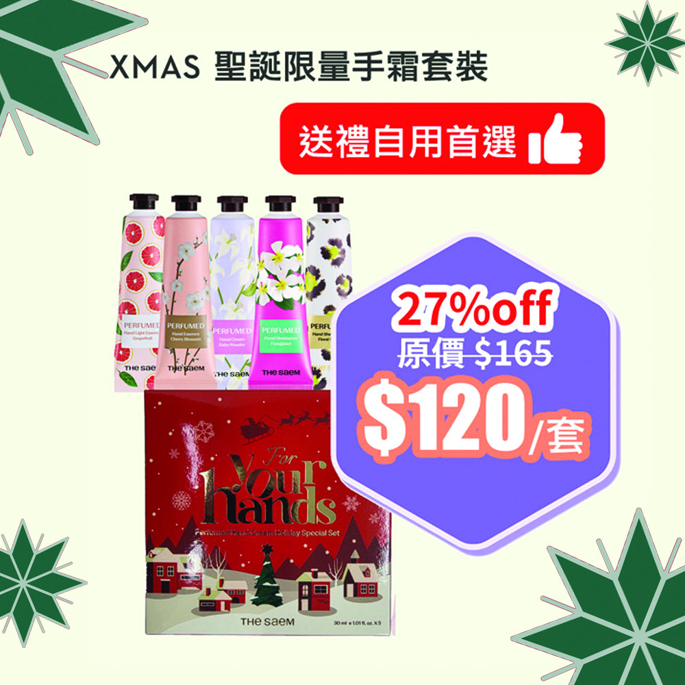 **節日限定XMAS 聖誕限量手霜套裝** 套裝包括: 1) Hand Light Essence - Grapefruit 30ml 2) Hand Essence - Cherry Blossom 30ml 3) Hand Moisturizer - Frangipani 30ml 4) Hand Cream - Baby Powder 30ml 5) Hand Shea Butter - Floral Musk 30ml 功效: 香氛保濕潤手乳,有5款不同質地,清爽到滋潤,有花香味,亦有清甜香氣,質地滋潤柔滑同時防止乾燥,而且方便攜帶,隨時隨地都可以散發出芬芳的花香味。