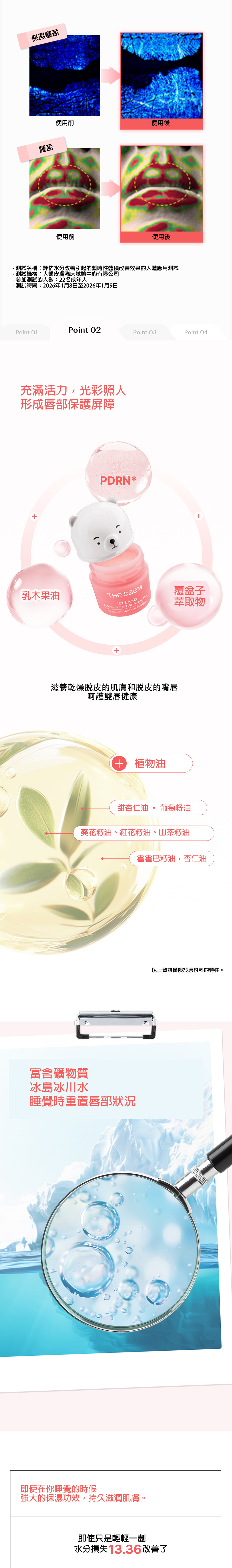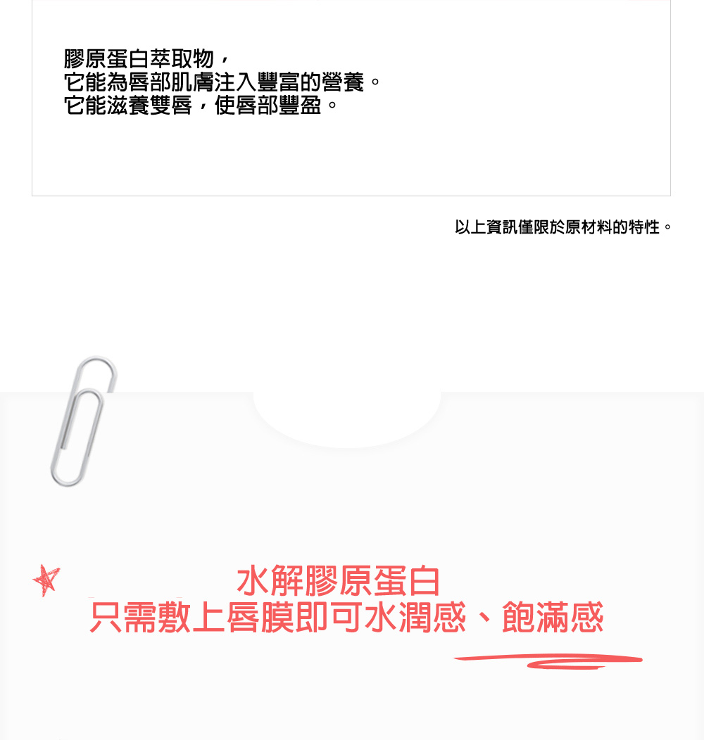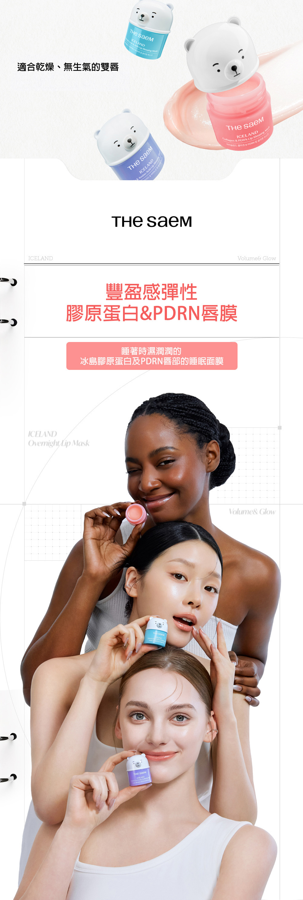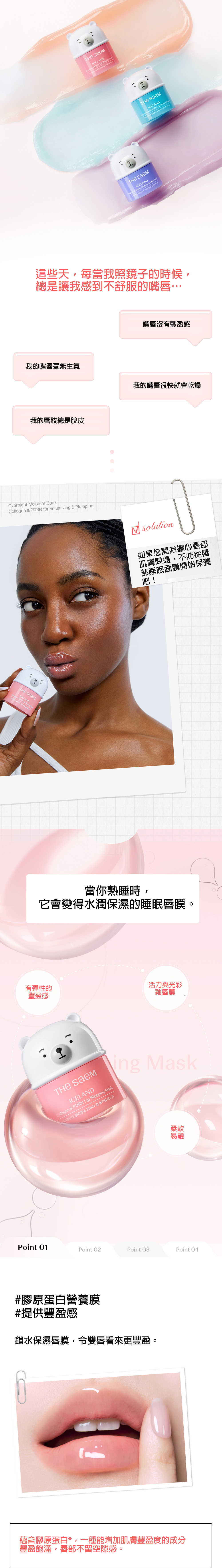 Iceland Collagen & PDRN Lip Sleeping Mask 冰島膠原蛋白PDRN睡眠唇膜 <產品成份> - 膠原蛋白:提升肌膚豐盈度,幫助填補唇部細小紋理。 - PDRN:源自海洋,有助強化唇部保護屏障,促進唇部健康。 - 乳木果油:深層滋養乾燥脫皮及唇裂問題。 - 覆盆子萃取物:提供活力,讓雙唇展現光澤。 - 冰島冰川水道礦物質:富含礦物質,在睡眠期間幫助重置唇部狀況。 <產品功效> - 豐盈飽滿:膠原蛋白與PDRN雙重作用,令雙唇不留空隙,視覺上更顯豐滿。 - 鎖水保濕:經人體應用測試證實,使用一次後,唇部水分流失改善13.36%。 - 修護屏障:形成透明保護膜,抵禦外來刺激,同時修復乾燥、脫皮與裂紋。 - 光澤亮麗:夜間持續滋養,翌日雙唇呈現水潤光澤。 <產品特點> - 夜間重置:在睡眠時持續發揮強大保濕功效,讓唇部狀況在酣睡中獲得改善。 - 易融化質地:接觸唇部溫度後輕輕融化,均勻貼合,告別厚重油膩感。 - 便攜設計:小巧尺寸,單手即可輕鬆握持,可放於口袋或小袋中,隨時隨地滋潤乾燥雙唇。 - 多用途:適合作為夜間密集保養,亦可用於妝後護理,形成光澤保護層。 <使用方法> 夜晚: 睡前取適量塗抹於雙唇,像敷面膜一樣,讓其在睡眠中充分吸收。 白天: 感到唇部乾燥時可隨時補塗,保持滋潤;或在唇部上妝前塗抹,增加光澤與柔嫩感。 容量:13g