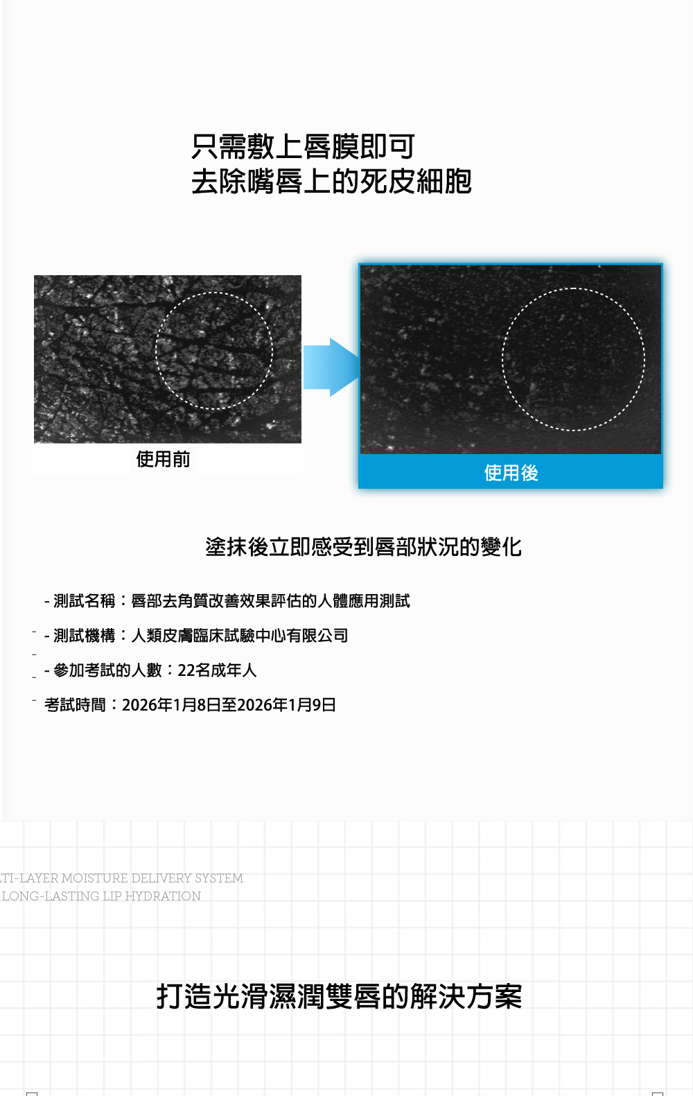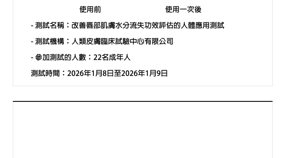 - 顯著保濕力:單次使用後,水分流失改善 12.63%,一次使用即可減少唇部乾燥狀況達 63.8%。