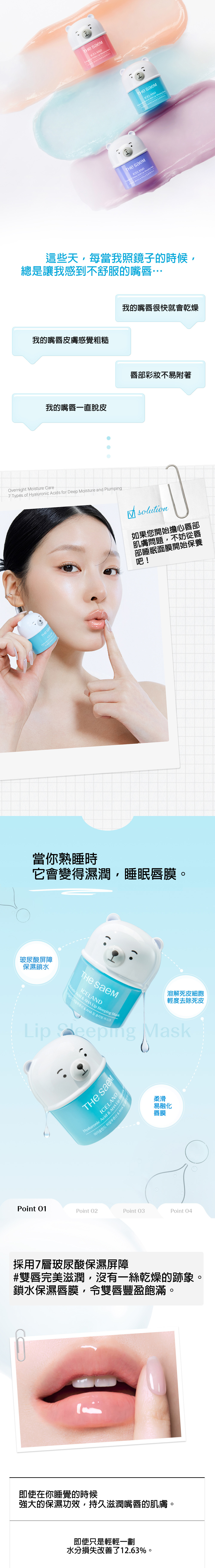 - 改善唇部困擾:針對嘴唇易乾燥、粗糙、脫皮、唇彩不易附著等問題,一夜之間讓雙唇變得柔軟光滑。