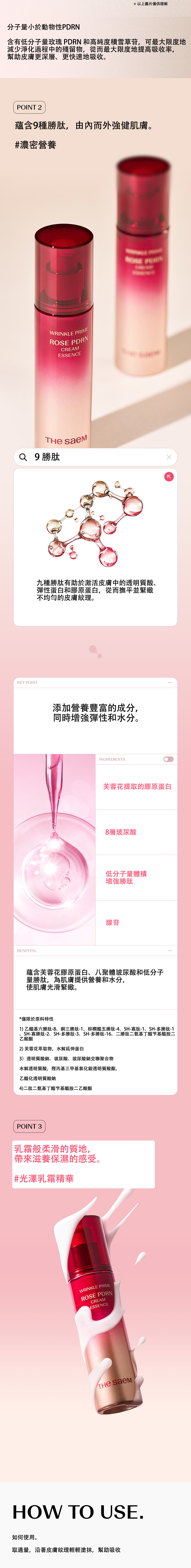 極緻抗皺玫瑰PDRN修復精華霜 Wrinkle Prime Rose PDRN Cream Essence **產品核心特色** 這是一款擁有乳霜般柔滑質地的精華產品,能帶來滋養保濕的感受。它融合了高濃度修護成分,質地豐潤卻易於吸收,旨在改善不均勻的肌膚紋理,同時為肌膚增強彈性和水分。 **核心成分與功效** 1) 低分子玫瑰來源植物性 PDRN - 分子量小於動物性PDRN,能更深層、更快速地滲透至肌膚底層,最大化吸收效率,從根源修復受損肌膚。 2) 95% 高純度積雪草苷脂質體 - 在純化過程中最大限度地減少了殘留物,確保成分純淨高效。與玫瑰PDRN協同作用,增強肌膚的自然屏障,有效改善受損肌膚狀況與彈性。 3) 複合保濕營養矩阵 - 芙蓉花提取膠原蛋白:為肌膚提供營養。 - 八聚體玻尿酸:包含8種不同形態的玻尿酸成分(如透明質酸鈉、水解透明質酸、乙酸化透明質酸鈉等),實現立體滲透的深層保濕。 - 低分子量胜肽:增強肌膚彈性,幫助肌膚緊緻。 **主要功效** - 深層滋養:如乳霜般的質地,能為肌膚提供豐富的營養與水分,告別乾燥。 - 改善紋理:針對不均勻的肌膚紋理,使肌膚更加平滑細膩。 - 提升彈性:強化肌膚結構,重現肌膚的緊實與彈力。 - 強效保濕:透過多層次玻尿酸成分,長時間鎖住肌膚水分。 **適用膚況與人群** - 希望同時改善肌膚彈性、膚質和皺紋者。 - 想要重拾光澤健康肌膚的人。 - 肌膚乾燥、暗沉,希望透過一款產品同時達到精華的滲透力與乳霜的滋潤感的人。 **使用方法** 取適量產品,於保養步驟中,沿著肌膚紋理輕輕塗抹並按摩,直至完全吸收。 容量:55ml